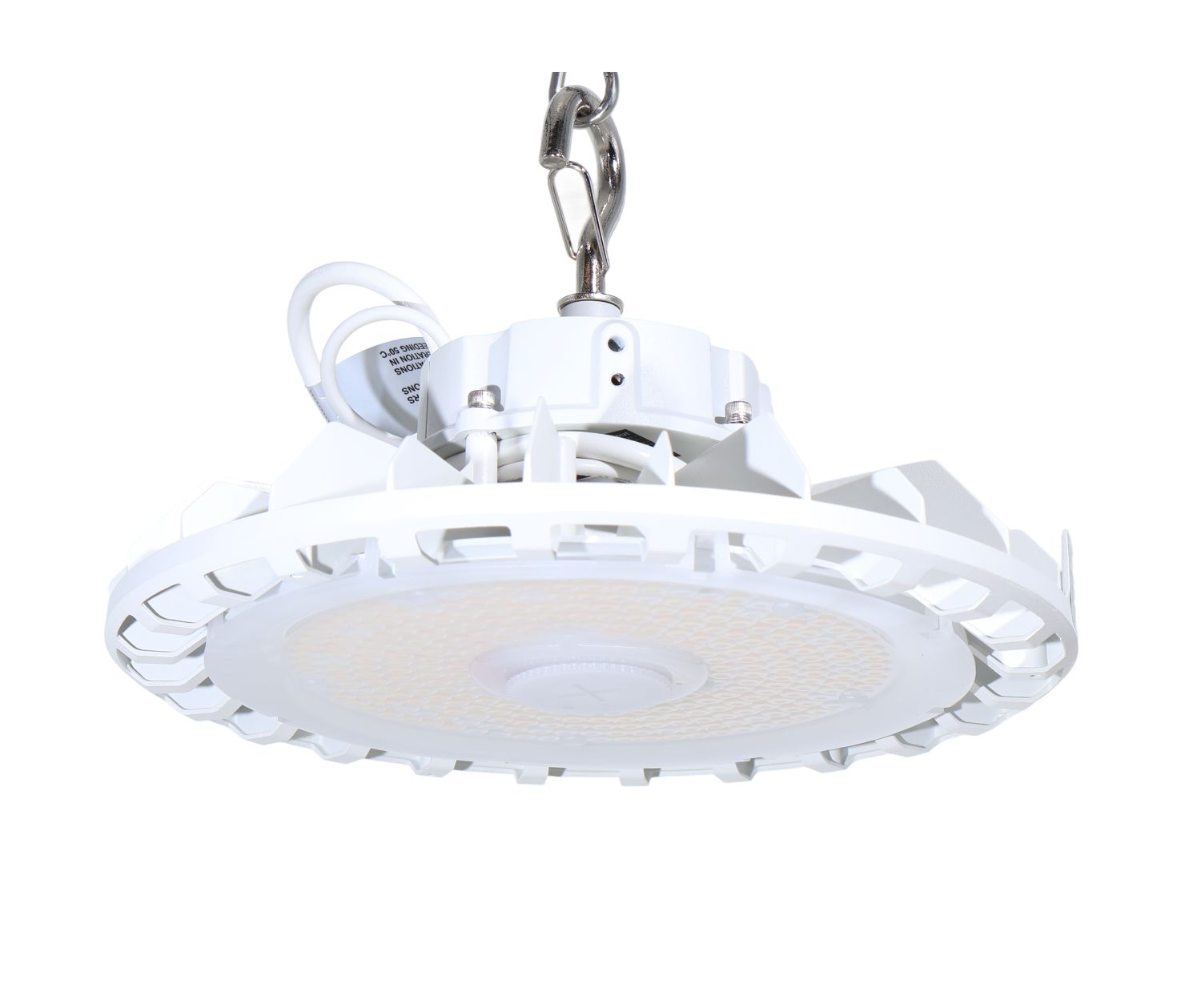 This adjustable UFO high bay is designed for high-ceiling commercial and industrial interiors requiring robust, efficient illumination. The fixture supports selectable wattages of 120, 160, or 200 watts, delivering up to 33,000 lumens. Typical installations include warehouses, manufacturing facilities, and distribution centers with mounting heights from 15 to 35 feet. The fixture is available in black or white housing with a frosted lens for diffused output.