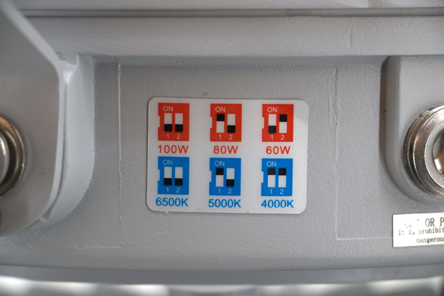 Wattage can be set to 60, 80, or 100 watts, with corresponding outputs of 8700, 11600, or 14500 lumens.