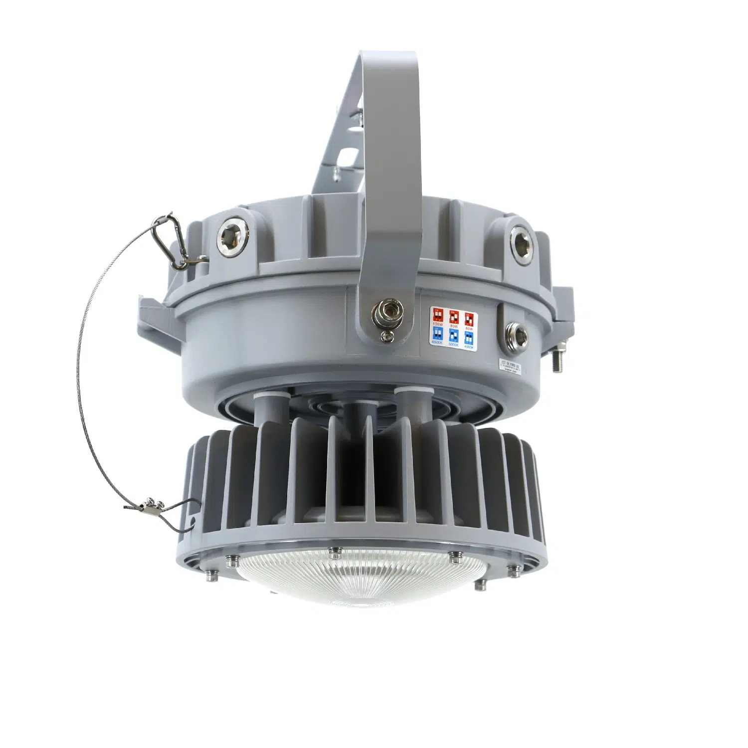 This is a round explosion proof LED light with adjustable wattage settings of 60, 80, or 100 watts. Output ranges from 8700 to 14500 lumens, supporting replacement of 400 watt metal halide fixtures in hazardous and demanding environments.