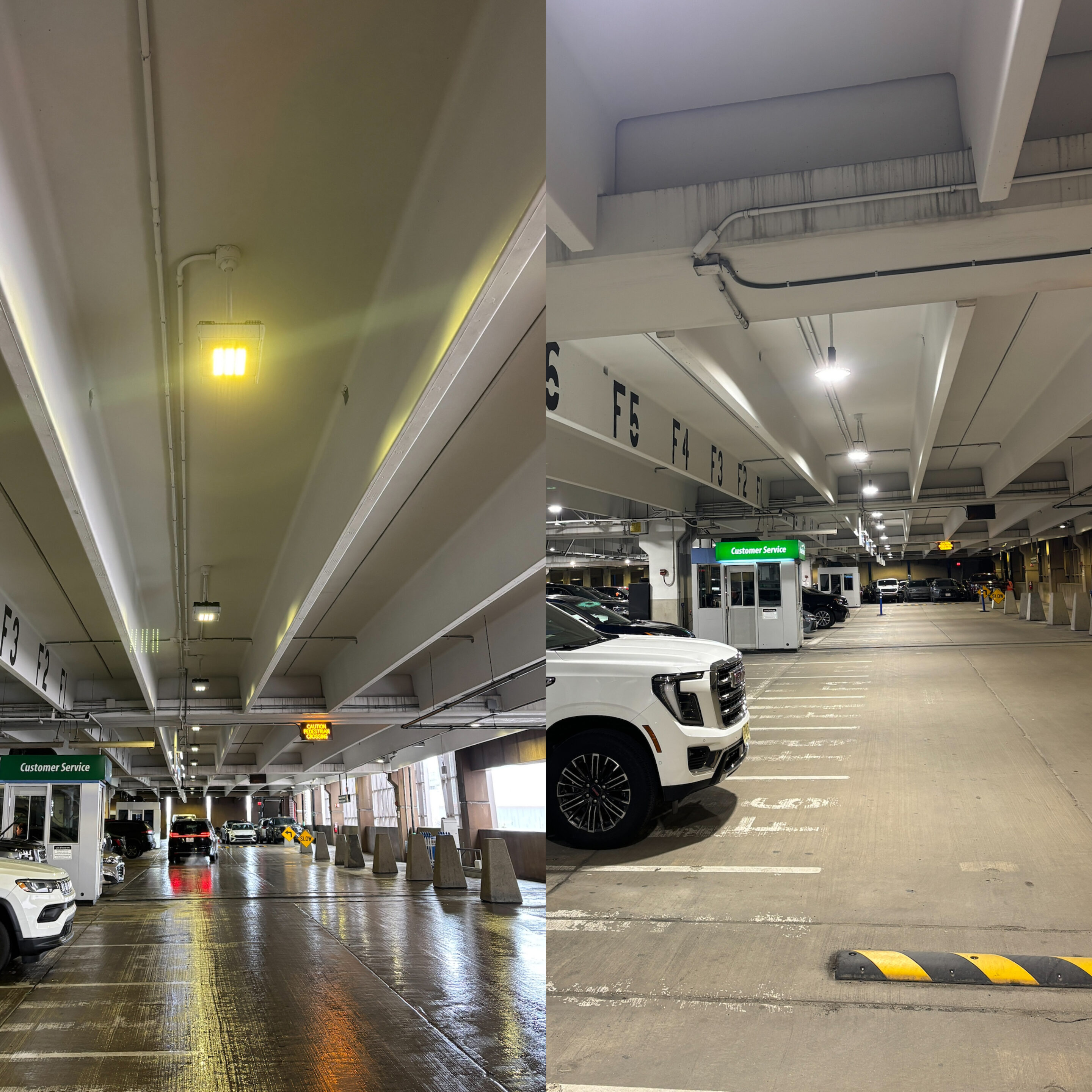 Following the upgrade, the increased light levels resulted in a brighter, more uniform environment that improved the visibility across the car return lanes. This is essential in parking garage settings, where enhanced lighting increases driver awareness, improves pedestrian visibility, and supports safer navigation throughout the space. Higher light levels also help reduce the risk of accidents, strengthen vehicle inspection security, and create a more comfortable, welcoming space for employees, drivers, and pedestrians.
